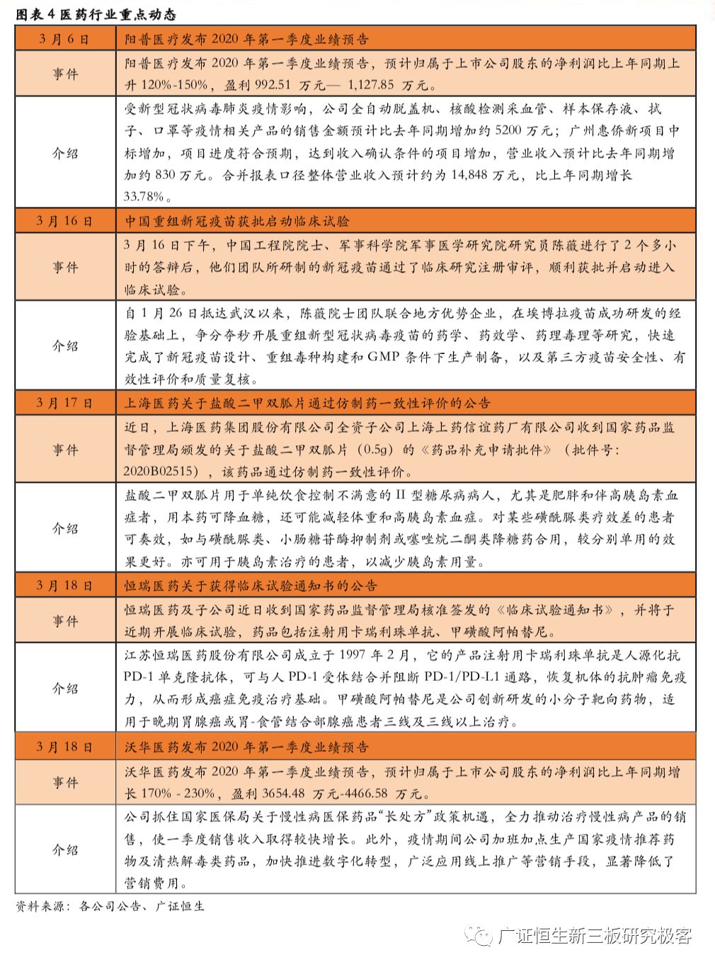 中国重组新冠疫苗获批启动临床试验,恒瑞医药收到注射用卡瑞利珠单抗、甲磺酸阿帕替尼的《临床试验通知书》;阳普医疗发布2020年第一季度业绩预告,归股东净利润预计同比上升120%-150%;新三板方面,圣兆药物启动在精选层挂牌工作;海外方面,WHO宣布新冠疫情进入“全球大流行”,疫情在国外持续恶化;美国新冠病毒疫苗第一阶段临床试验开始;世界上出现第二例被治愈HIV患者。