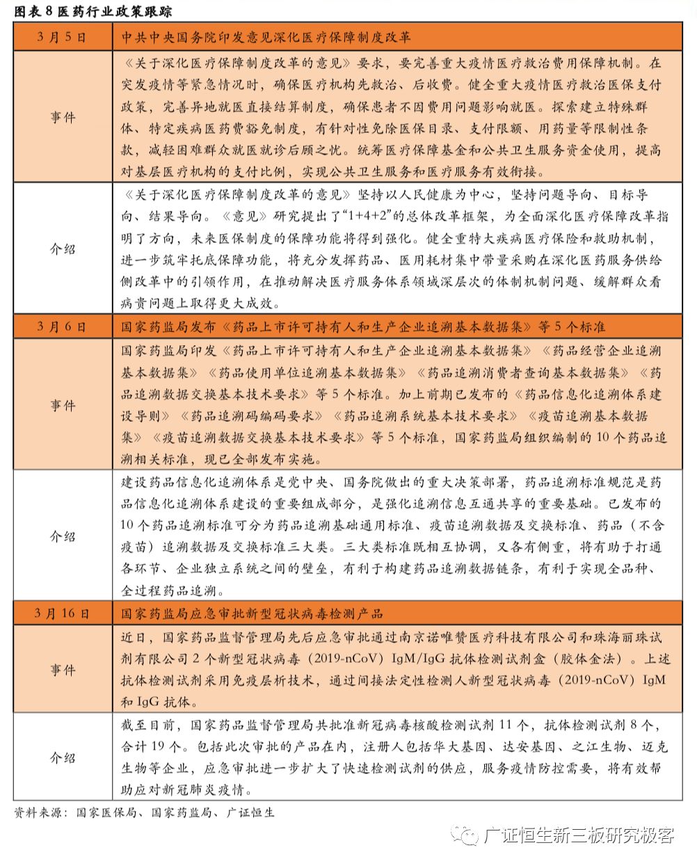 3月5日,中共中央国务院印发意见深化医疗保障制度改革,强化医保制度的保障功能;3月6日,国家药监局发布《药品上市许可持有人和生产企业追溯基本数据集》等5个标准,有利于药品追溯;3月16日,国家药监局再应急审批新型冠状病毒检测产品,助力抗击新冠肺炎疫情。