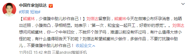 但没想到,晒个照都能引来有心人士的借机炒作——“中国作家刘信达”在微博上公开指责熊黛林不该借腹中胎儿炒作自己,也是够戏精了,花姐只想说,想用这种蹭热度的方式让自己出名,真的有点太不要脸。