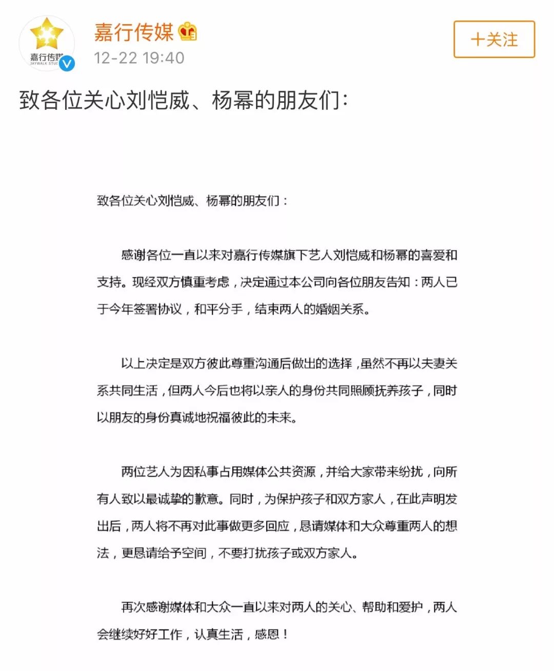 昨天(2018 年 12 月 22 日)傍晚,嘉行传媒发出了官宣:刘恺威和杨幂已于今年签署协议,和平分手,结束两人的婚姻关系。