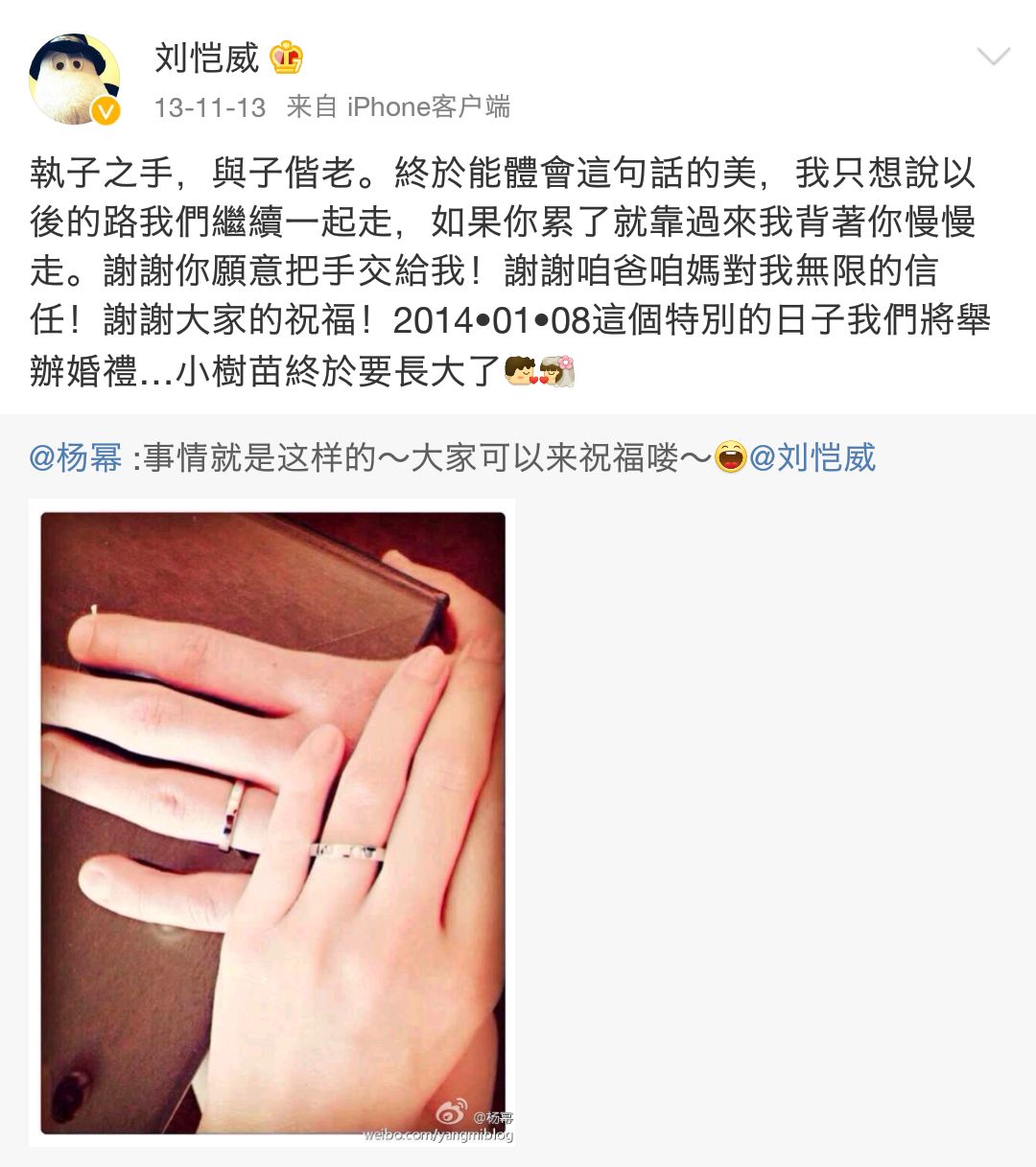到 2013 年 11 月 13 日,杨幂直接晒出戒指宣布结婚喜讯,简单粗暴。
