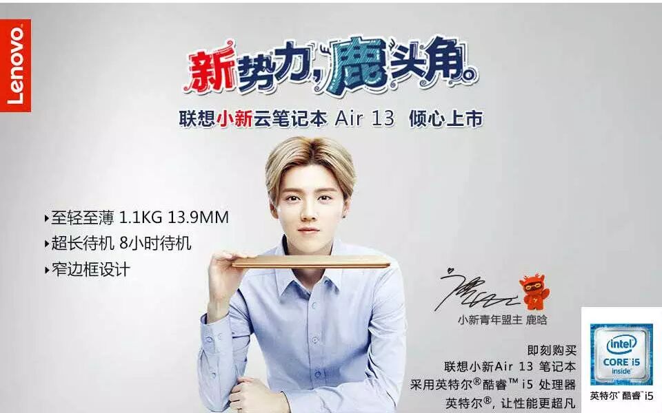 作为国内PC行业的老大联想自然不会放过年轻化市场。由鹿晗代言的小新电脑,就是联想针对年轻人使用需求及审美定位而设计的专线产品。轻薄、便携、高颜值是其主打特色,选择年轻、阳光、帅气的特鹿晗来做代言,契合度超高。