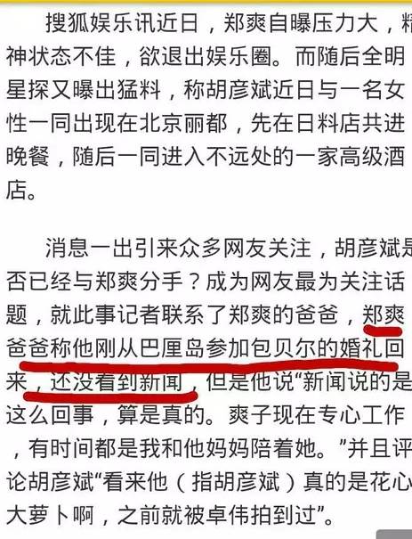 针对此传言,有媒体联系到了郑爽的爸爸,爽爸被问及女儿与胡彦斌分手一事称“算是真的,爽子现在专心工作,有时间都是我和他妈妈陪着她。”对于胡彦斌与一名女性的绯闻,爽爸评论称:“看来他真的是花心大萝卜啊,之前就被卓伟拍到过。”