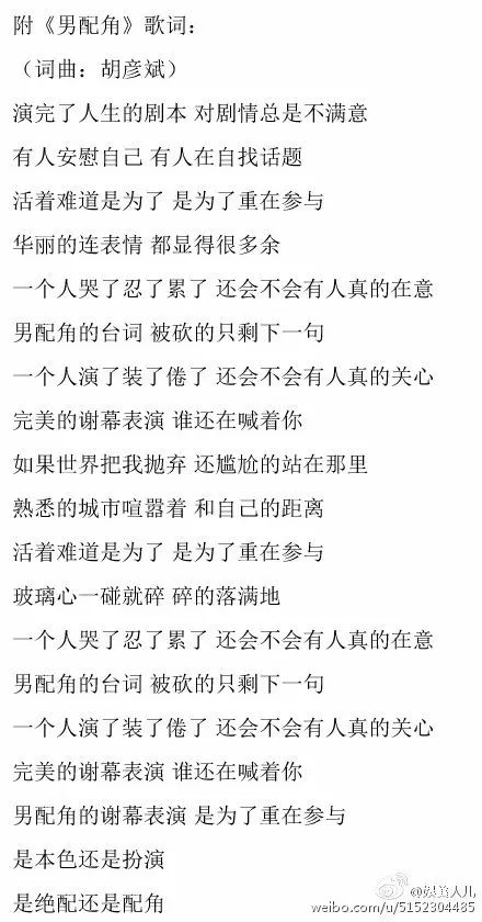 随即媒体联系到郑爽的爸爸,爽爸证实两人已经分手,并直言胡彦斌是“花心大萝卜”。沉默了一天的胡彦斌终于在晚间选择通过新浪娱乐独家发布一首歌曲来进行回应,在这首名为《男配角》的新歌里,胡彦斌写道:“一个人哭了忍了累了还会不会有人真的在意”、“男配角的谢幕表演 是为了重在参与”,尽显悲伤情绪。