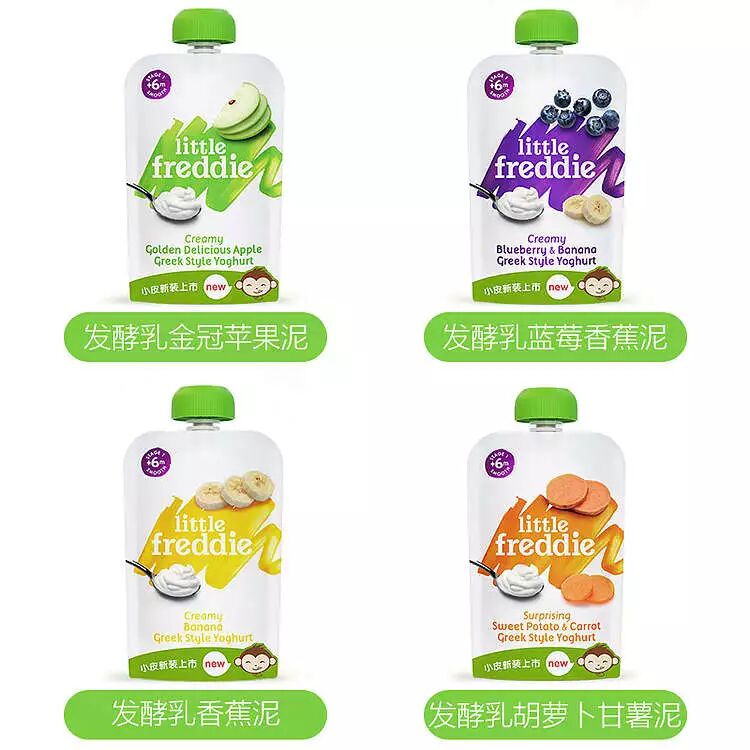 比如英国Little Freddie小皮果泥就非常优秀啦,共有8种口味,不同水果组合搭配,味道各不相同,哪怕是挑食宝宝也能找到喜欢的,6个月以上的宝宝就可以食用啦~