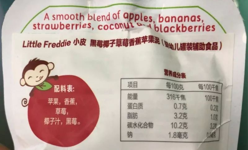 楚楚我先来检查一下黑莓椰子草莓香蕉苹果泥的配料表。