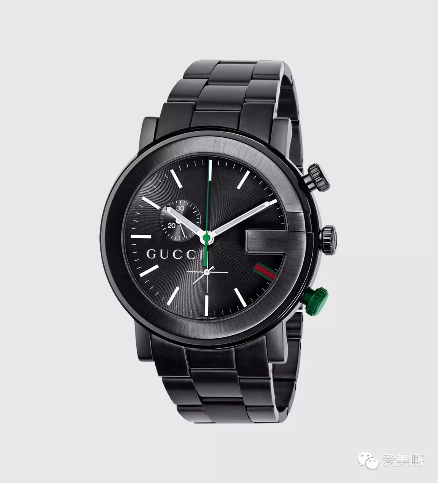 款式:G-chrono 黑色精钢黑色计时器,大小两个表盘刻度,4 点钟处配以绿色/红色/绿色条纹