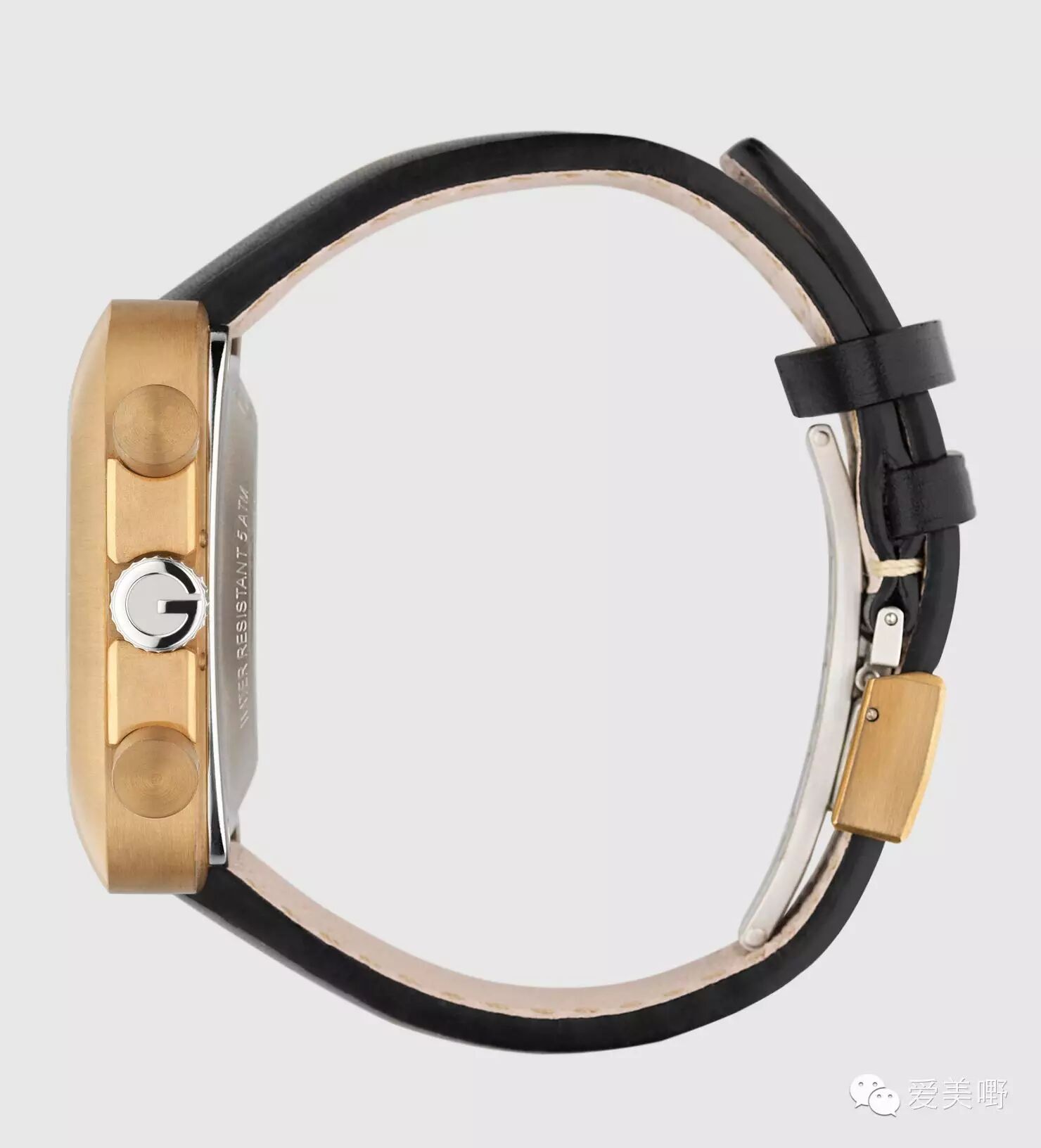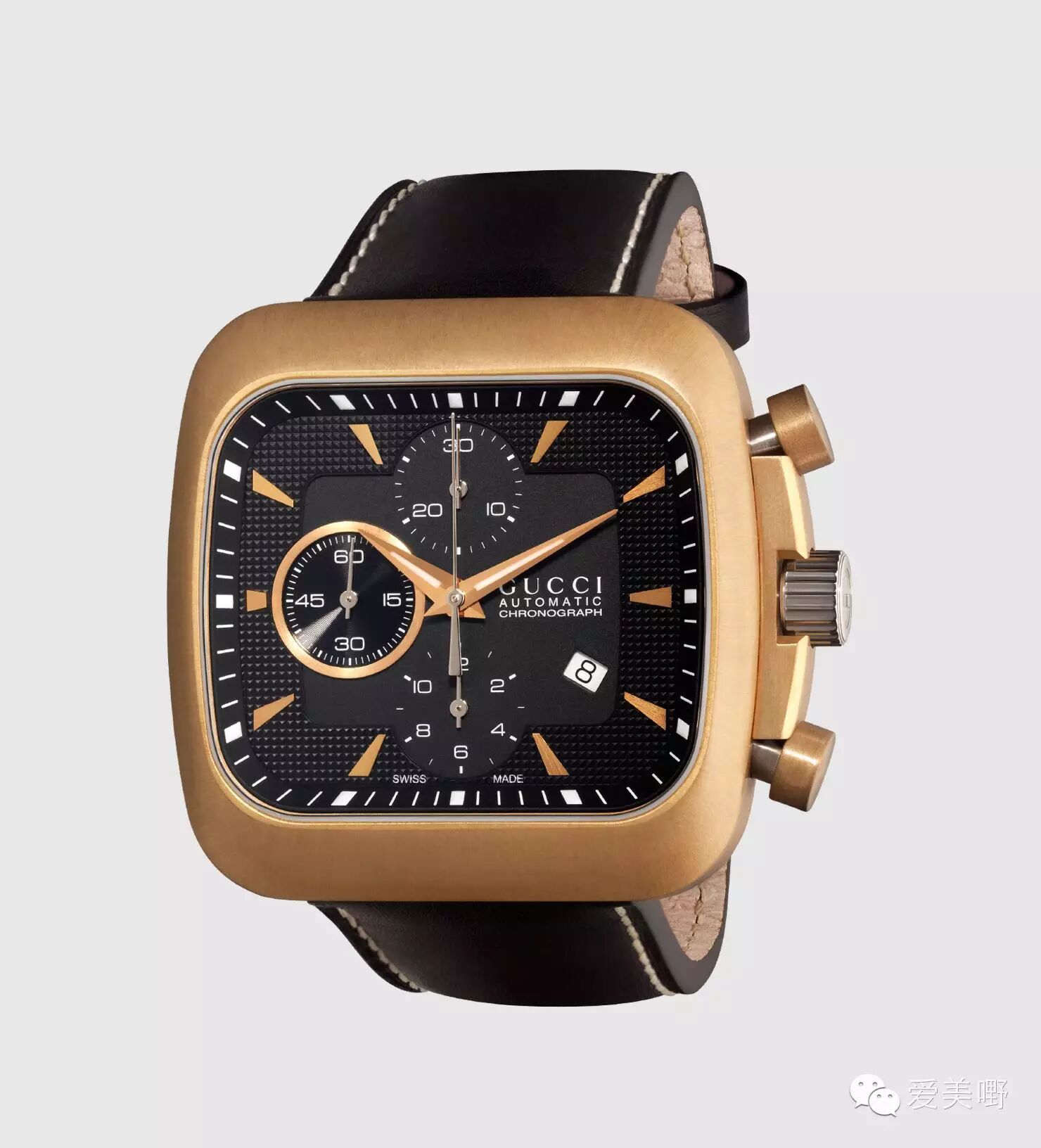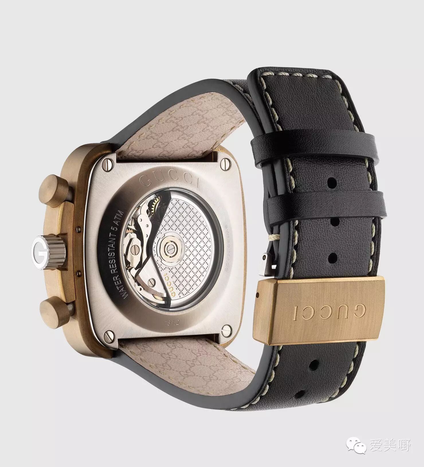 材质:拉丝青铜色不锈钢表壳,蓝宝石水晶表面,黑色真皮表带