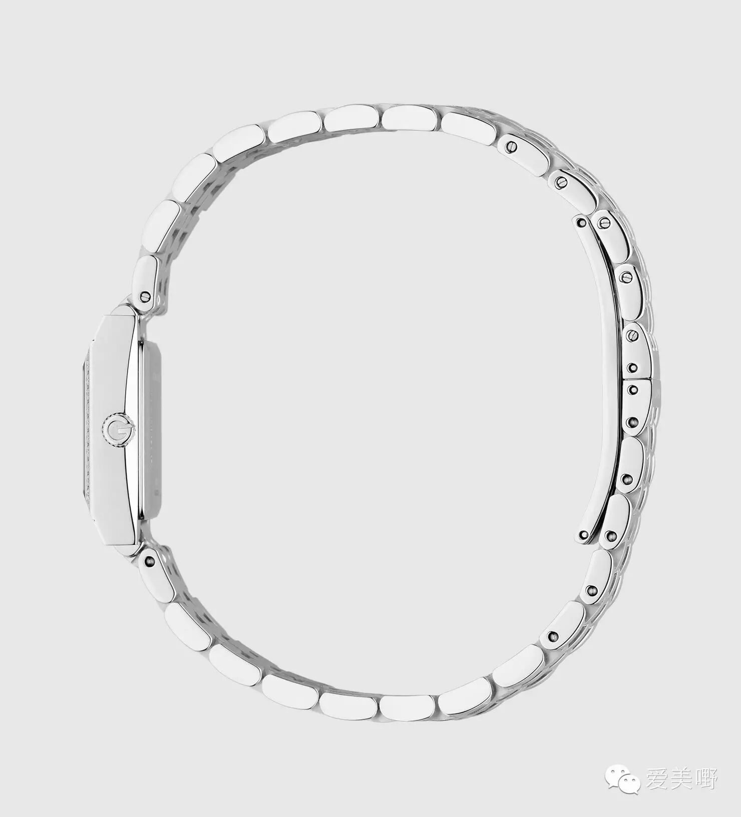 款式:蓝宝石水晶表面,白色珍珠母贝表盘,不锈钢链式表带,配有展开式按压表扣