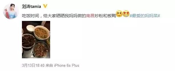 今年3月13号,刘涛发了一条微博,向全国人民晒了南昌炒粉和板鸭。
