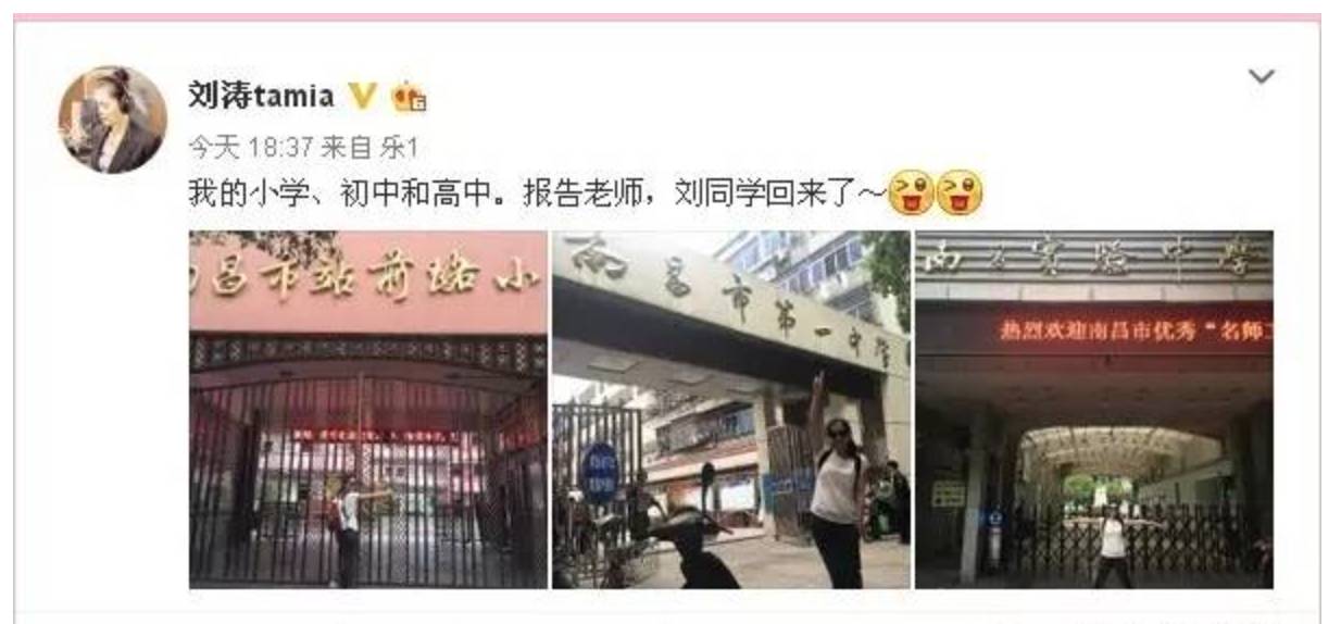 昨天下午6点半,刘涛发了一条微博,微博内容显示她回南昌了,还在少时母校拍照留影。
