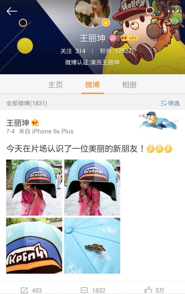 7月4日,王丽坤发微博称再片场认识了一位新朋友,图中王丽坤穿着古装剧服装,她手上还撑了一把看起来很可爱的伞,她的伞上面有一只蝴蝶,她还指着伞上面,样子美丽极了。