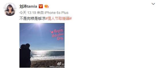 “国民媳妇”刘涛也来秀恩爱。她晒出与老公王珂在海边相拥的背影照,配文调侃,“不是狗粮是够凉”,并把老公暖暖的怀抱戏称为“情人节取暖器”。
