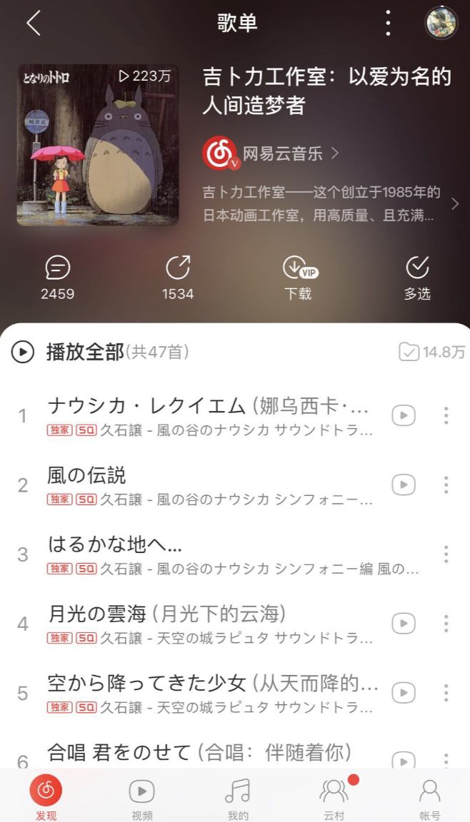 而就在今天,网易云音乐宣布与吉卜力工作室达成版权合作。获得旗下动画音乐全面授权,包括《龙猫》《千与千寻》《哈尔的移动城堡》《崖上的波妞》等知名动画热门音乐作品。