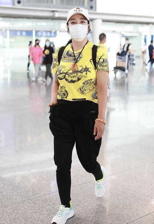 照片中刘晓庆穿的是一件黄色的短袖搭配黑色的裤子。虽然穿着打扮比较朴素,但是这样的穿搭方法挺适合她也非常的自然,穿上这一条黑色没能够反而更加轻松。尤其是黄色给人带来的感觉就是非常的阳光大气,穿在她身上也很显年轻。