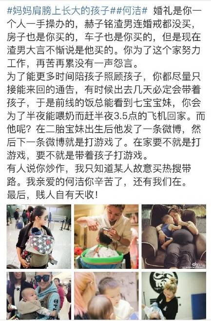 婚礼是何洁一人操办的,赫子铭连婚戒也没买。不管有多少通告,工作到多晚,何洁都会及时赶回家喂奶。而赫子铭在家就是打游戏——