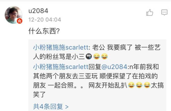 四分钟后,被其称为“老公”的人留言,“什么东西?”其回应称:“老公,我要疯了,被一些艺人的粉丝骂是小三”。