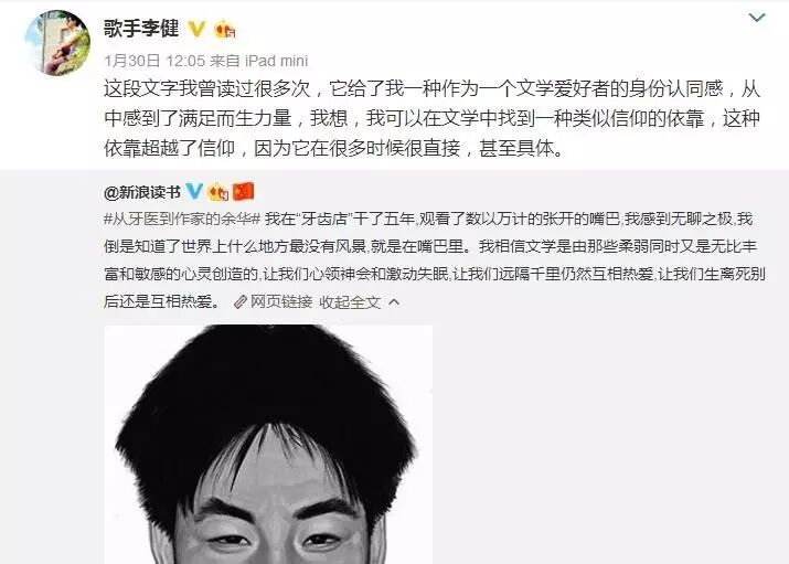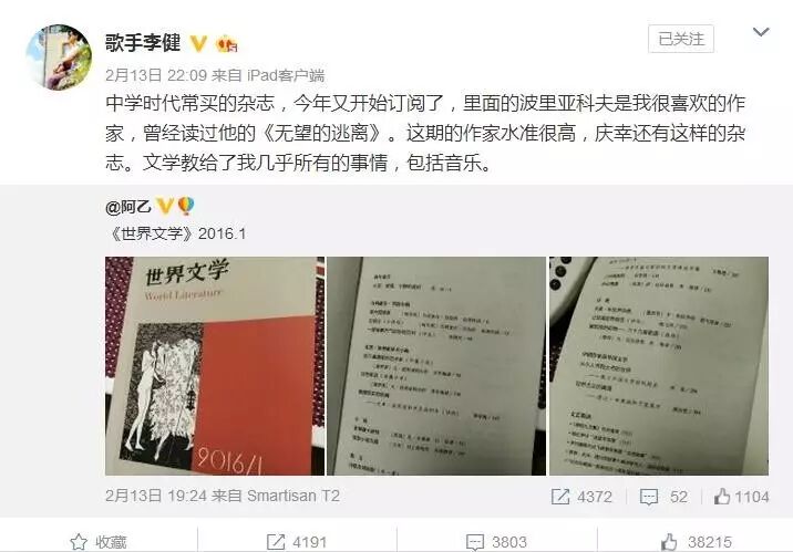 热爱歌唱的李健,酷爱文学,他曾在微博里这样说:“文学教给了我几乎所有的事情,包括音乐。”