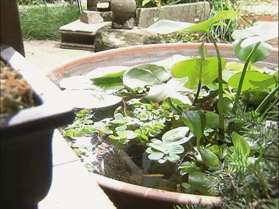 随着微风而摇摆的风铃下面,有一缸碧绿的水生植物;