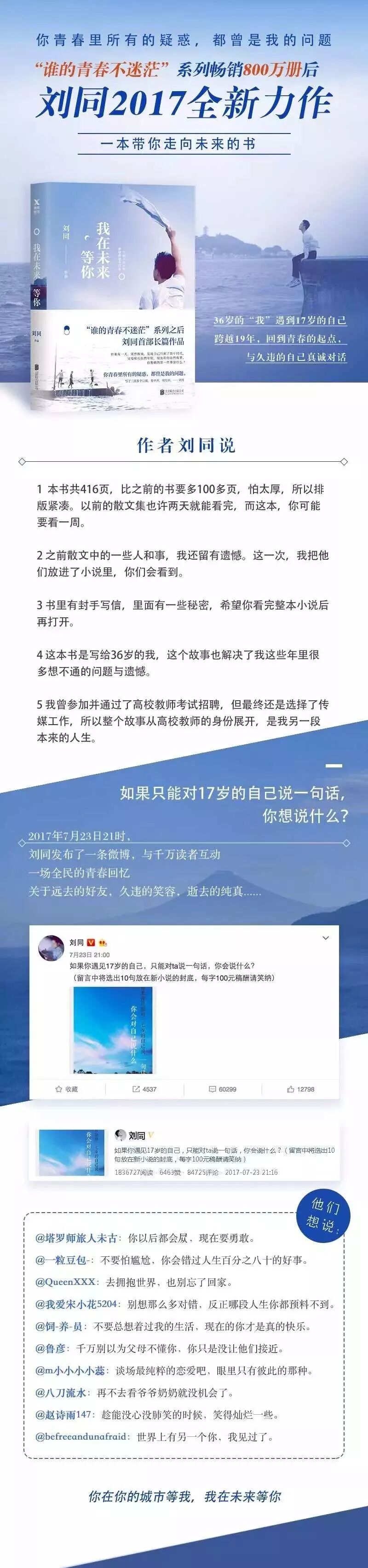 熟悉刘同的人当然知道,他从未停止书写,也从未离开。这些年,他说迷茫,其实是说:与其迷茫,不如一路往前闯;他说孤独,其实是说:与其孤独,不如自己去成为一个有力的世界;他说光亮,是希望每个人能找到自己的那束光。