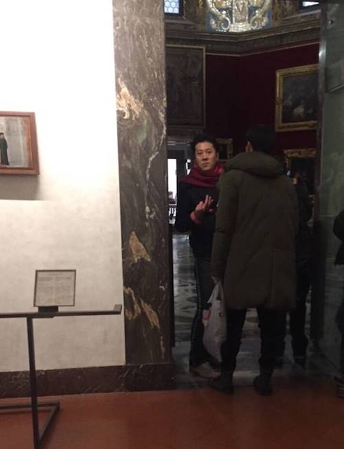 蔡国庆在意大利和几个男生一起游玩,那种气场很奇怪。