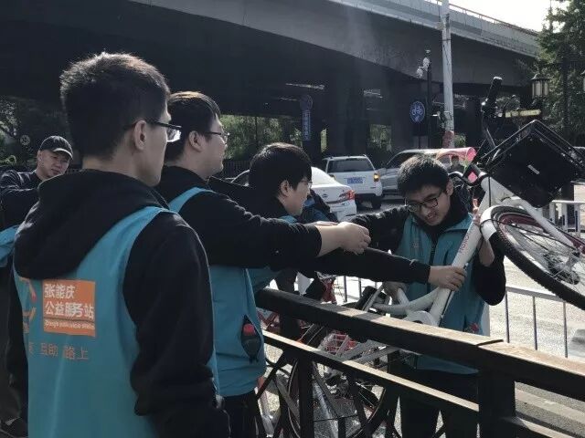 同心合力,同学们把占用机动车道的共享单车搬到划线的黄线内。