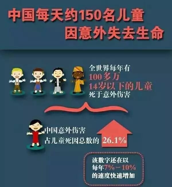 数据显示,中国每年有7.1万儿童死于跌落、中毒、溺水、交通事故等意外伤害,意外死亡占儿童总死亡率的26.1%。即每天有近150名儿童因伤害而死亡,为中国0-14岁儿童的首位死亡原因。