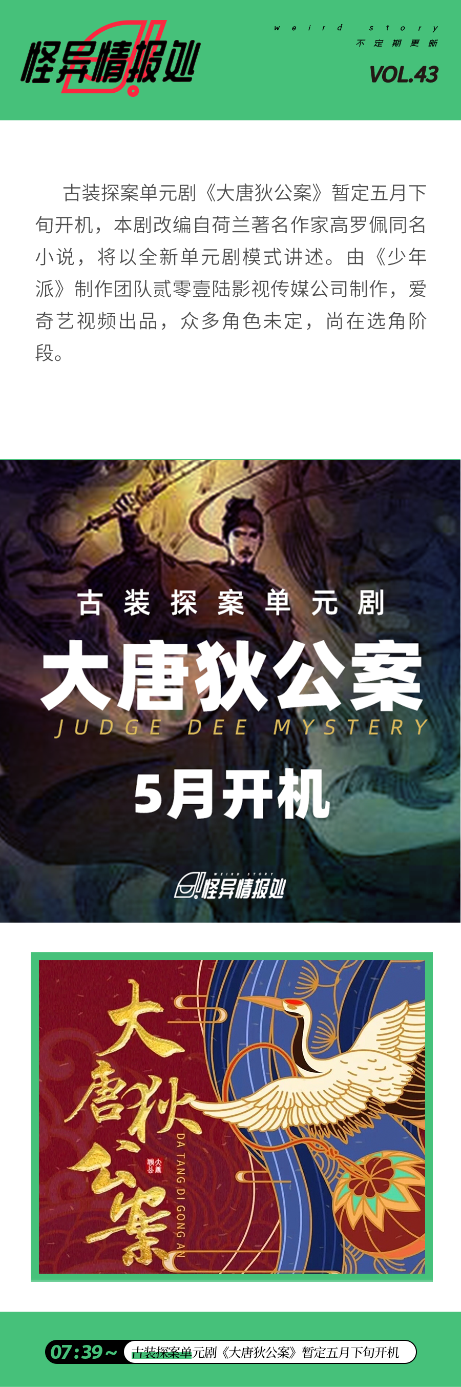 网飞又双叒出悬疑类的新剧了,在点到为止里提到过的《大唐狄公案》也即将被拍成电视剧。悬疑推理类的剧情题材越来越多,也越来越受到观众的喜爱,一直专注于推理的我们也感到非常地开心。接下来就一起看看本期有哪些影视和书籍的新鲜资讯吧!