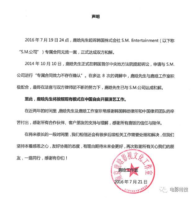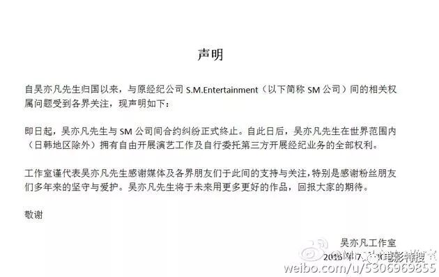 2016年7月21日下午,吴亦凡工作室在微博发声明,表示吴亦凡与S.M公司合约纠纷正式终止。