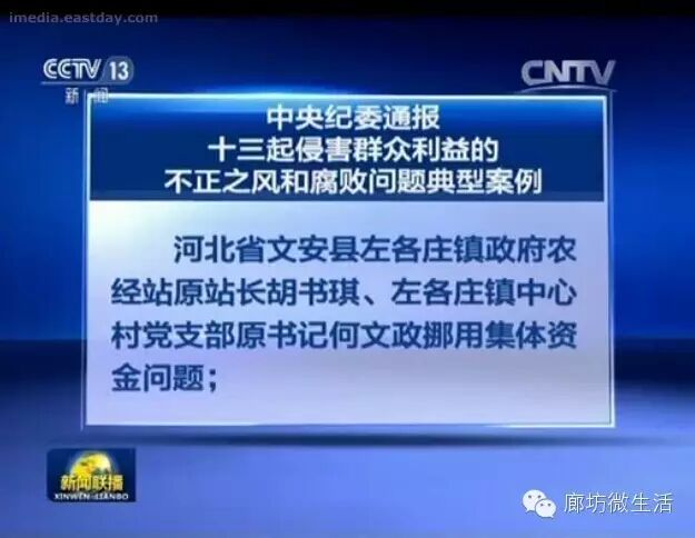 据廊坊纪检监察网4月26日消息:日前,中央纪委通报了13起侵害群众利益的不正之风和腐败问题典型案例,其中包括:河北省文安县左各庄镇政府农经站原站长胡书琪、左各庄镇中心村党支部原书记何文政挪用集体资金,胡书琪受到开除党籍、行政开除处分;何文政受到开除党籍处分;司法机关已依法追究2人的刑事责任。