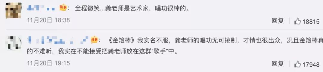 还有人说:“《金箍棒》我实名不服,龚老师的唱功无可挑剔,才情也很出众,况且金箍棒真的不难听,我实在不能接受把龚老师放在这群‘歌手’中。”
