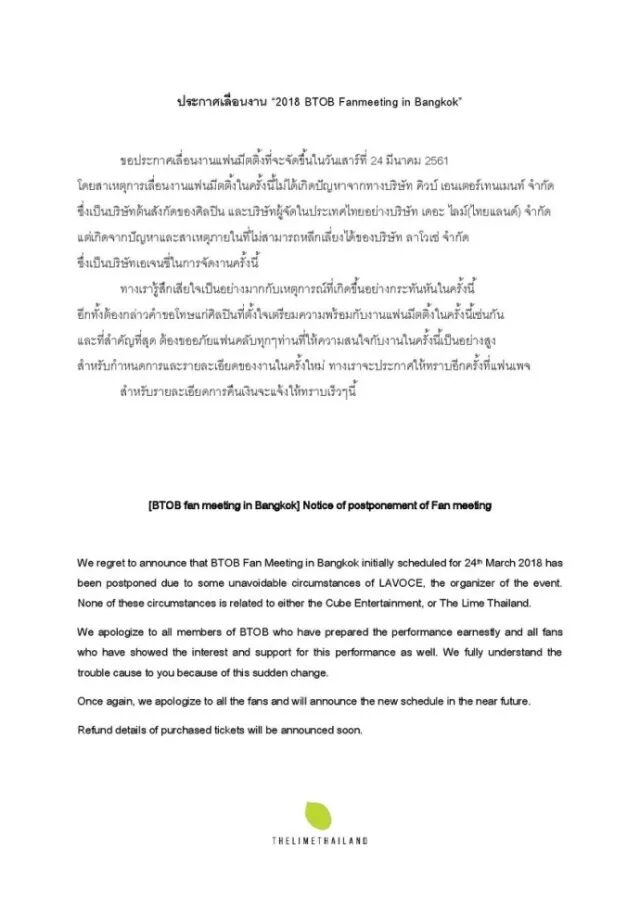 BTOB原定3月24日举行的BTOB泰国粉丝见面会因不可抗拒因素决定延期