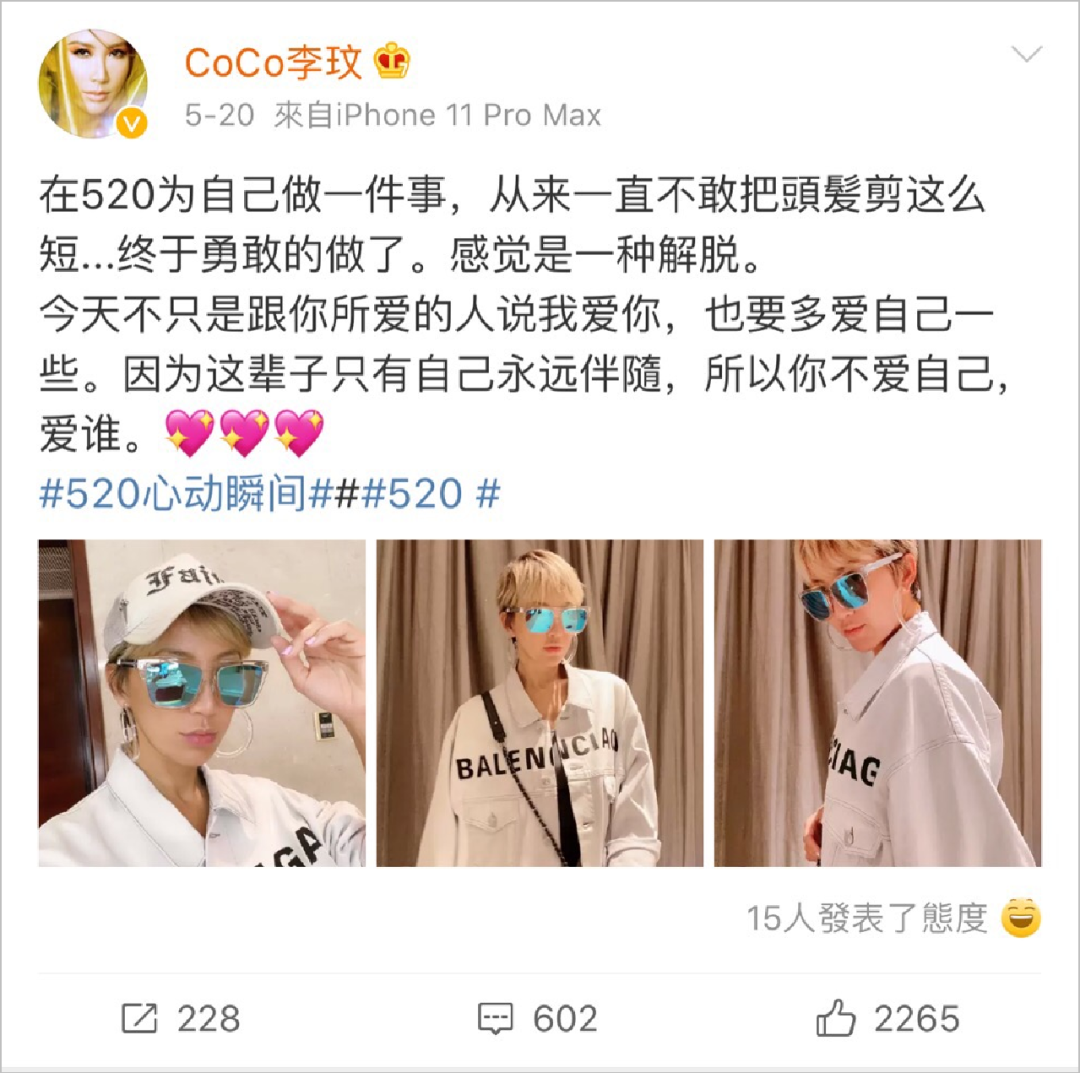 今年5月20日,李玟剪了短发,她在动态中这样写道:“从来一直不敢把头发剪这么短...终于勇敢的做了,感觉是一种解脱。”