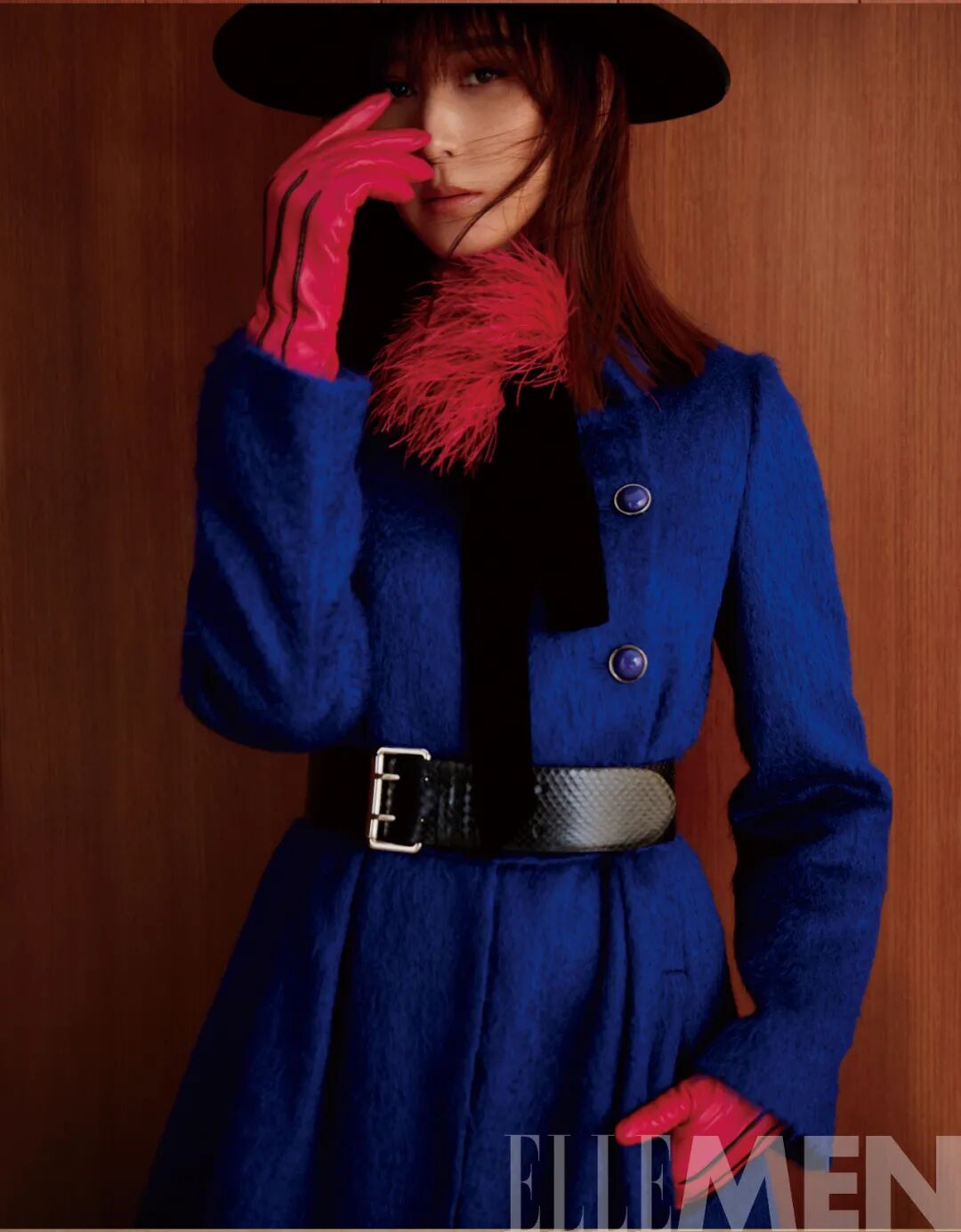 蓝色大衣、粉色胸针、手套和礼帽 均为Emporio Armani