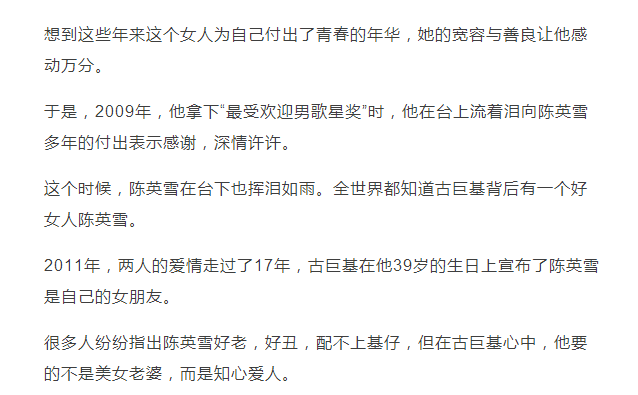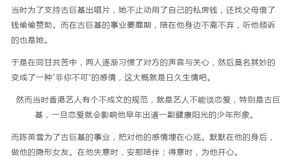 很久之前,古巨基拿到新人奖,忘记感谢陈英雪。回去之后他向她道歉,她却云淡风轻的说:“没关系,等你拿了最受欢迎男歌手奖再说”