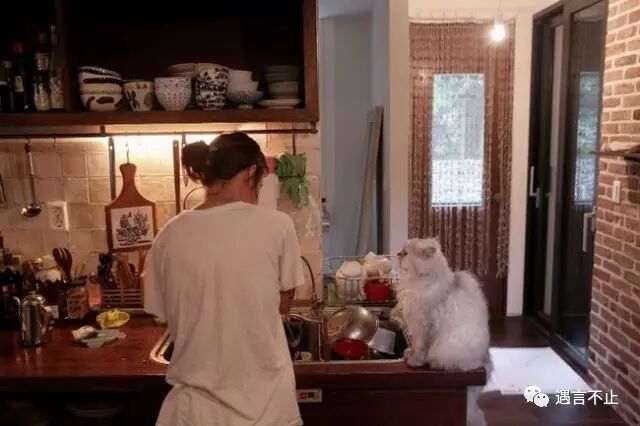 门口是没有铺砌的砂土地,院子里的草疏疏落落,屋中没有半件贵重的家具,布沙发上盖着毛巾被,遮盖猫咪挠的破洞,厨房中堆满了杂物,洗碗槽里泡着盘子,炉头上半锅剩菜,吃饭时椅子不够还要去借。因为要准备录节目,乱乱的书架和桌子底下干脆挂块布帘遮起来。