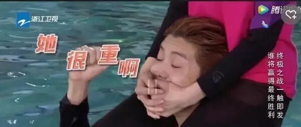 还记得上一期的《跑男》里,有一场泳池撕名牌的环节,泳池才1米2,结果到热巴下水的时候,她就缩在一边,各种害怕,先是一脸懵逼。