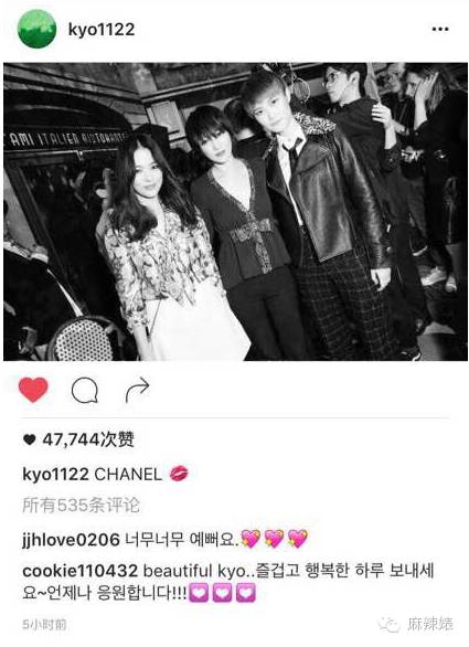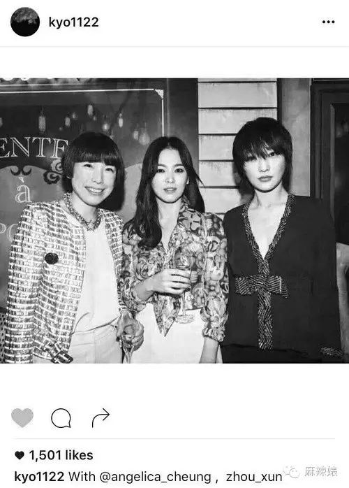宋慧乔发了一篇ins,里面是她,周迅,还有旁边一桌李宇春三个人的合影。