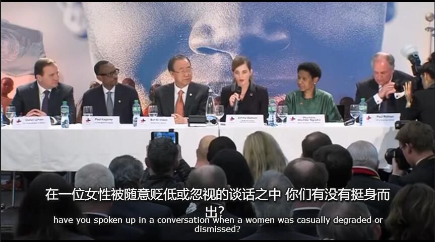 “今天,我们启动了项名为”他为她”的运动。我向你伸出手,因为我需要你的帮助。我们希望终结性别不平等,为此,我们需要所有人都参与其中。这是联合国同类运动中的第一项: 我们希望努力并激励尽可能多的男人和男孩倡导性别平等。而且希望这(性别平等)不只是空谈,而是确确实实的看得见摸得着。