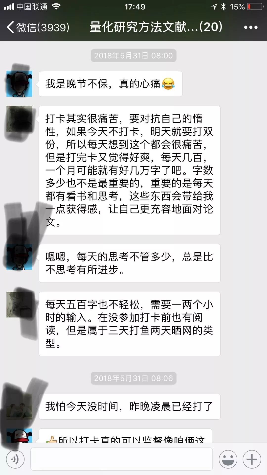 就这样,石头哥彻底变成了一个操心的老妈子,不但挨个到大家的打卡内容上去点赞,还要时不时发点评论。不得不说,学习确实是反人性的,谁要是不承认,我一定和他急!不过,学习也是可以形成习惯的。据石头哥观察,第一个星期,大家打卡的惰性是很重的,进入第二个星期,慢慢就变成了一种习惯,大家就渐入佳境。而且,更重要的是,石头哥看到了大家的进步。不但在群里谈学术,谈还谈人生、谈理想、谈合作(内心戏有点多),还一起探讨大家自己写的论文,那气氛简直不要太好!