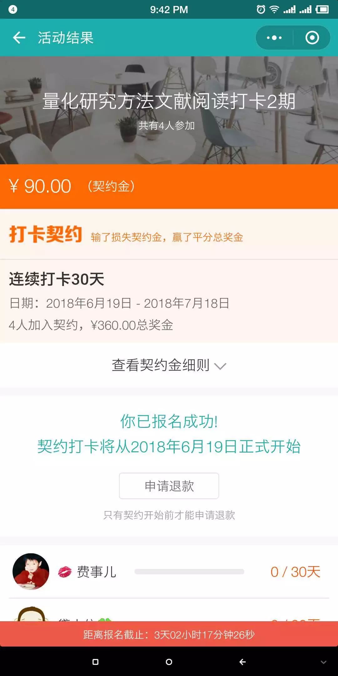 3 规则:每天必须完成一次打卡。一共有两次补打卡的机会,但一旦有一天未打卡,即便后面补签,也将失去契约金。全部完成30天打卡活动后,坚持下来的同学,将平分所有的契约金,由系统自动完成,微信会收取0.6%的手续费。群主不收取任何费用。