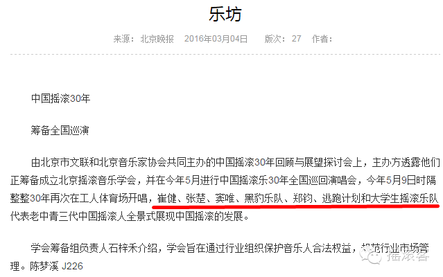 该报道称今年的5月9日中国摇滚乐30周年巡回演唱会将在工体馆拉开序幕,崔健、张楚、窦唯、逃跑计划和大学生乐队等将代表老中青三代摇滚人登台演出。
