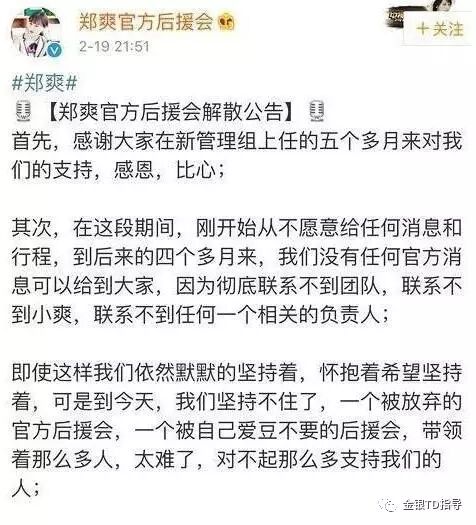 近日“郑爽官方后援会”发布解散公告,称联系不上任何相关负责人,现在实在坚持不住了,称是一个被抛弃的官方后援会,表示对不起大家。