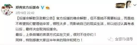稍后“郑爽官方后援会”再次更新微博,再次解释解散原因,解释说郑爽不希望我们管理组辛苦,牺牲太多,而影响自己的生活。