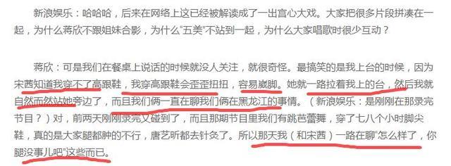 蒋欣解释是因为自己穿高跟鞋歪歪扭扭,宋茜怕她摔倒,就一路上拉着她上台,然后自然而然的就站在了一起,聊天聊的也是节目的事情。