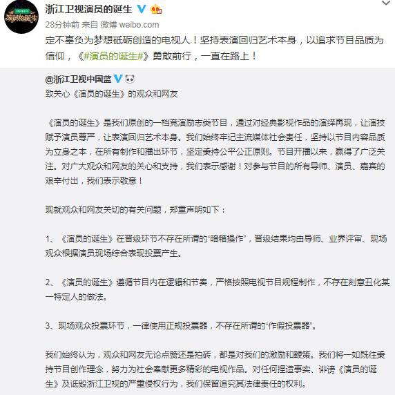 1. 浙江卫视19日发表声明,称《演员的诞生》晋级环节不存在暗箱操作,观众投票均使用正规投票器。节目遵循内在逻辑节奏,严格按照电视节目规程制作,不存在刻意丑化某一特定人的做法。此前袁立曾指浙江卫视恶意剪辑,使用假投票器。