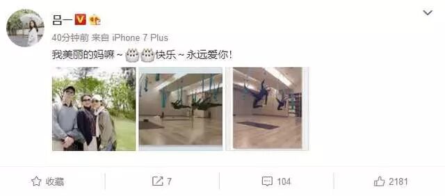 4月7日,演员吕一在微博上为妈妈庆生,晒出与妈妈一起踏春和做瑜伽的照片,并且配文表示:“我美丽的妈嘛!生日快乐,永远爱你”;简练的文字表达妈妈对自己的几十年的养育之恩。