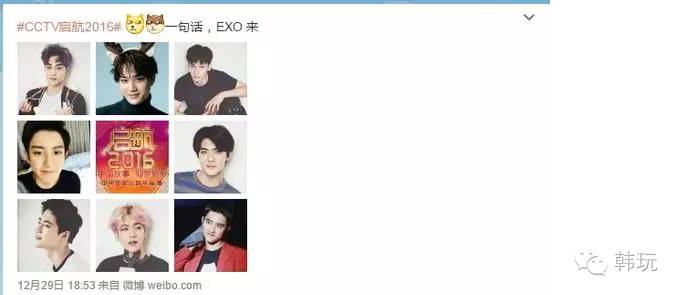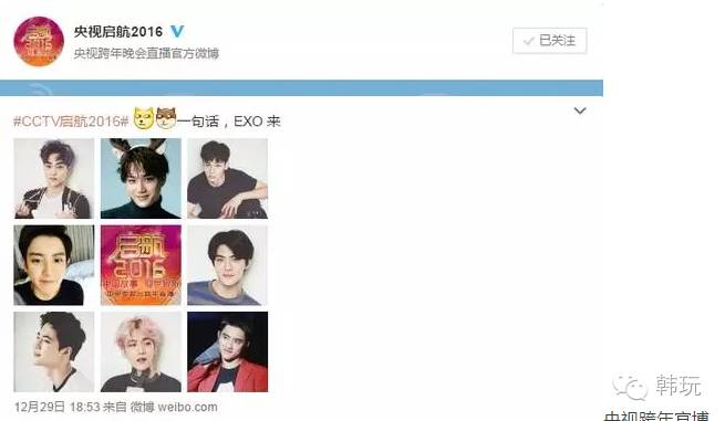 12月29日下午,央视跨年晚会官微“央视启航2016”公开了韩国人气组合EXO将加盟的消息,引发热议。据央视综艺消息,EXO除了张艺兴之外的其他8名成员,将登上央视跨年晚会的舞台,而张艺兴将参加东方卫视跨年。
