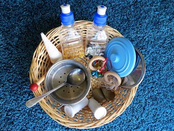 娃6个月开始会对周围的声音很敏感,这个时候就可以开始制作有声音的感官瓶来训练听觉。随着娃年龄的增大,咱还可以利用更多的东西给他们进行音乐启蒙。就比如说下面这个音乐宝藏篮。