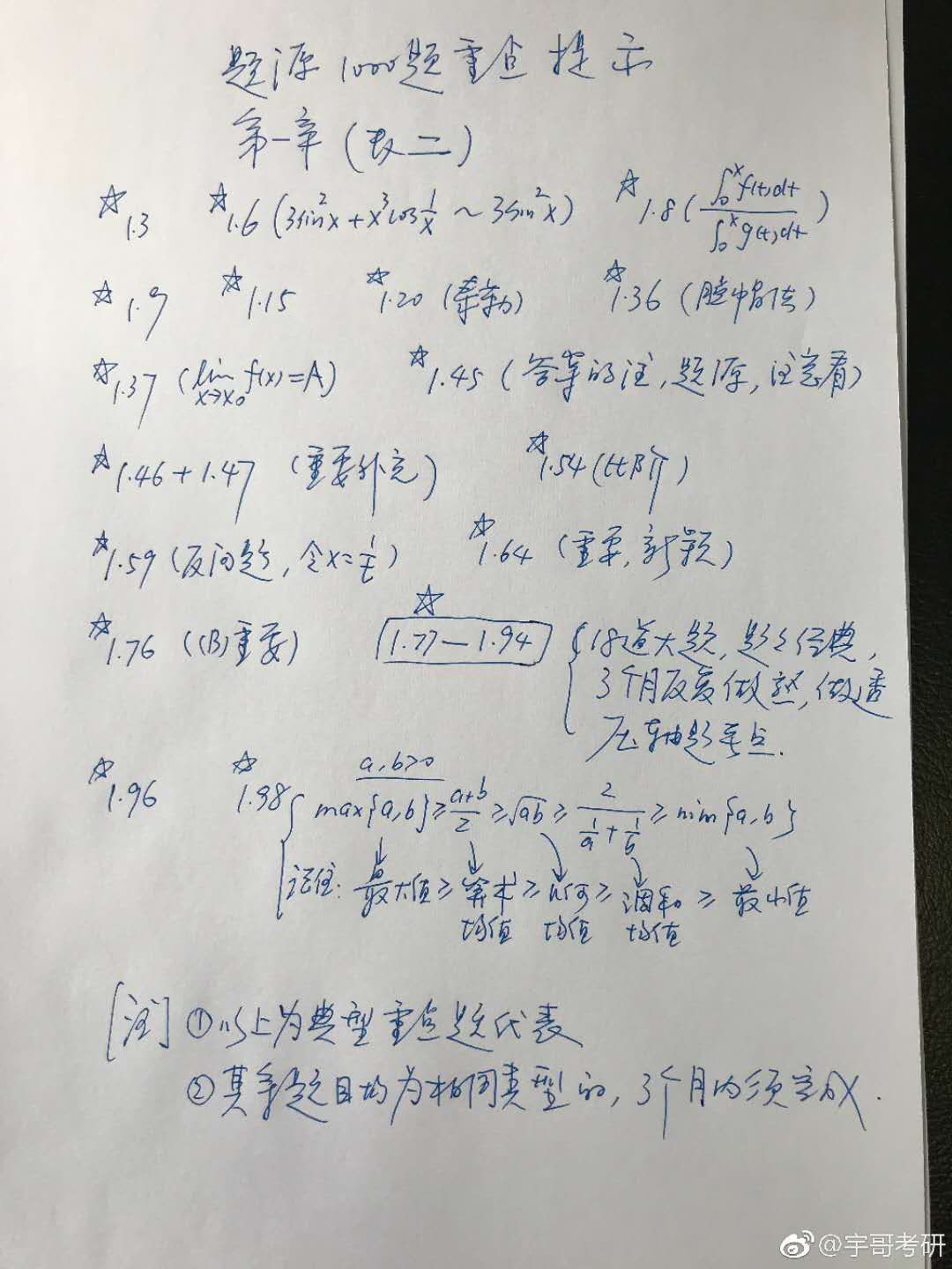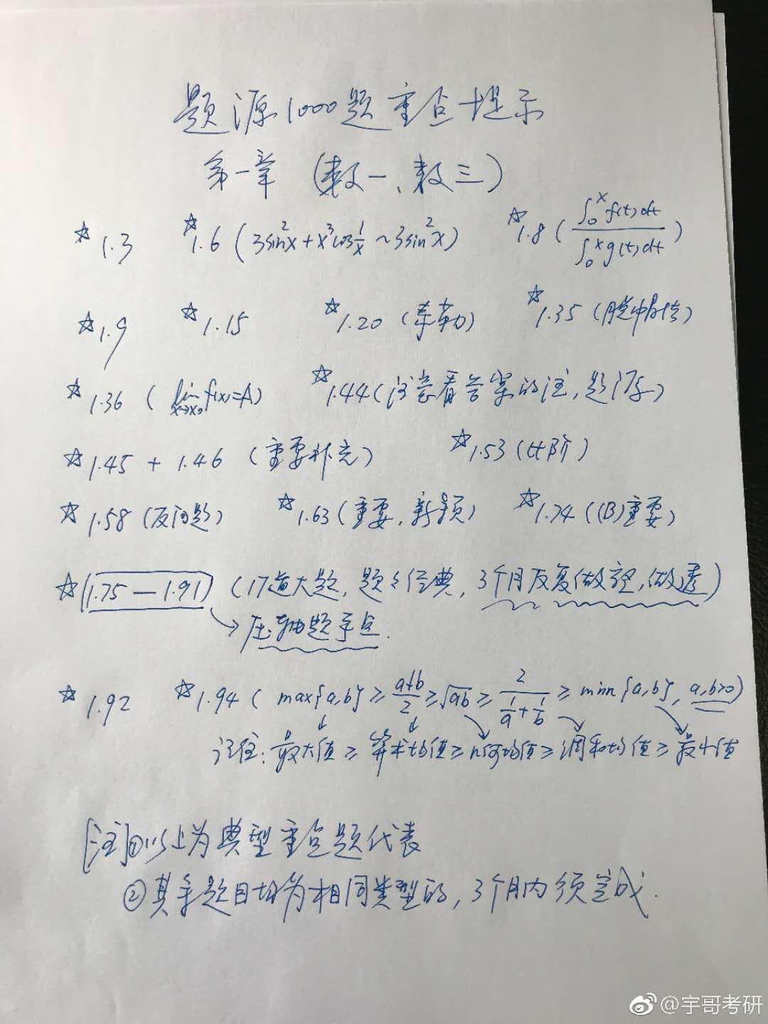 张宇老师的基础课已经在陆陆续续的开始更新了,最近1000题开始上市了,很多同学可能已经拿到手了,照张宇老师说的偶数年题目会偏难,复习就要更卖力了,稳扎稳打。很多同学一直在追求看视频快,听视频配合下做题这样更好,看视频是老师带你看题,如何把握题目的解题思路,自己做题就要靠自己了。张宇老师的1000题上市了,有拿到手并开始做的同学,关注下老师特别列出了100题第一章重点题型和重要关注点,这些题目和老师讲课的内容关联度是很高的,希望大家重视起来。